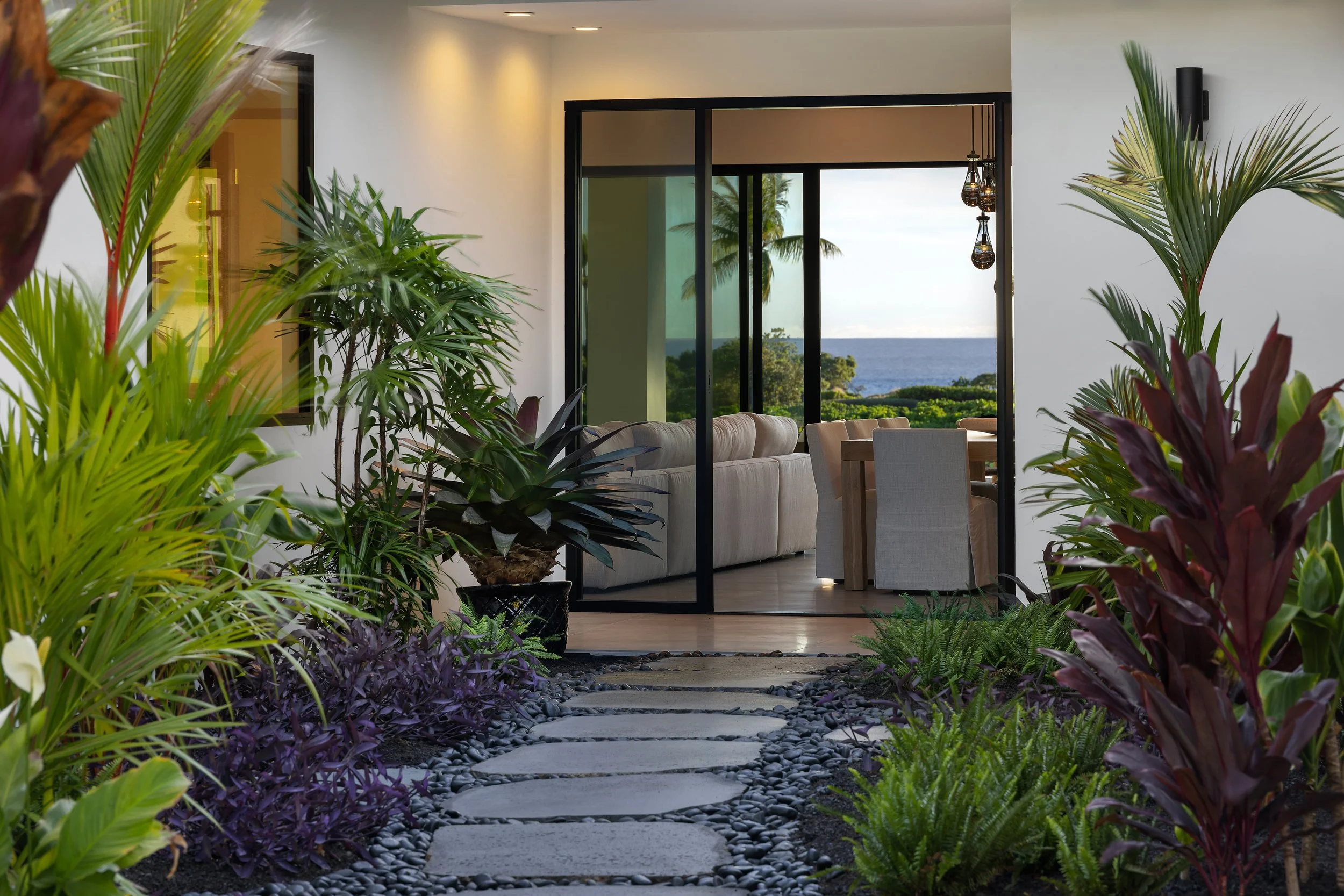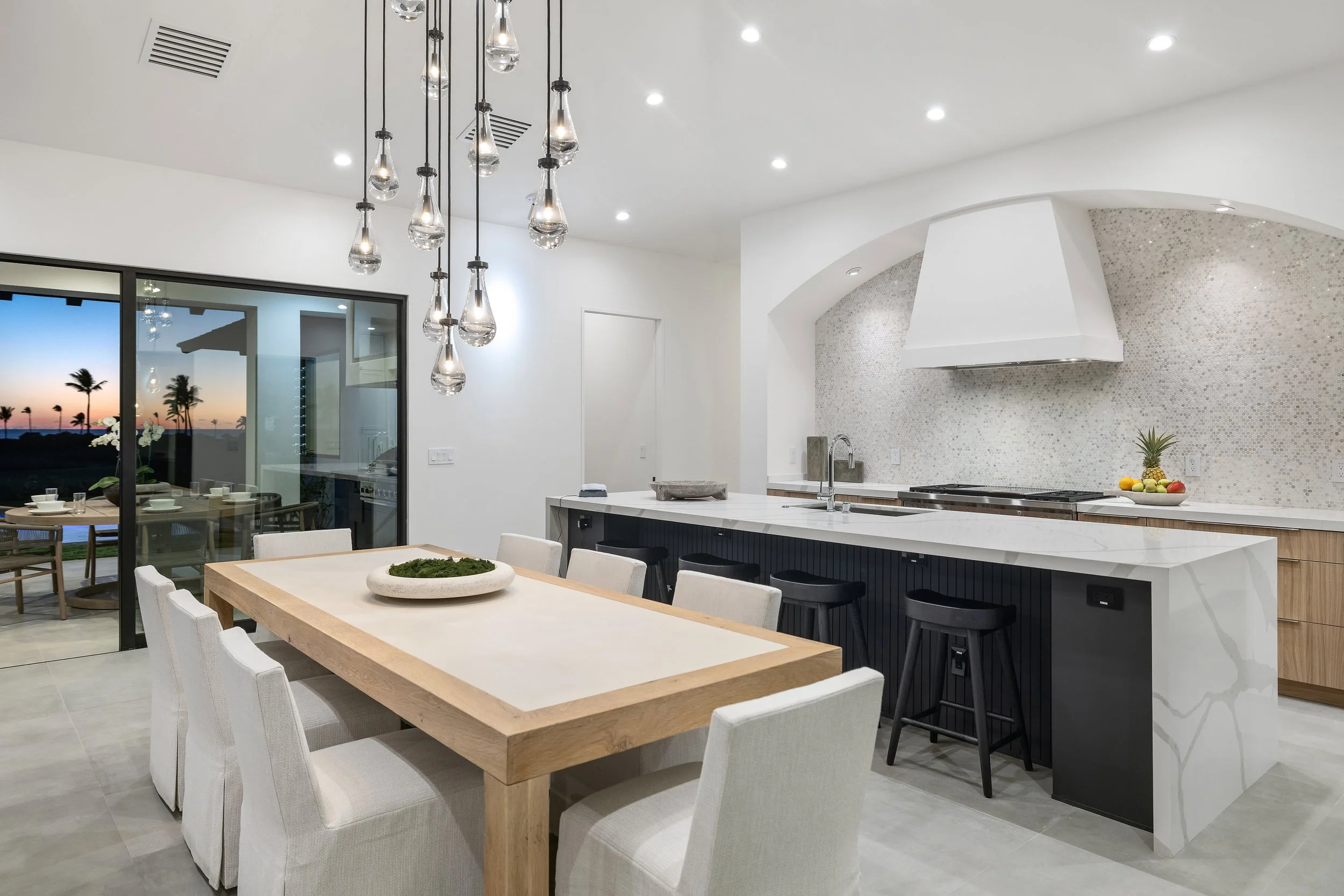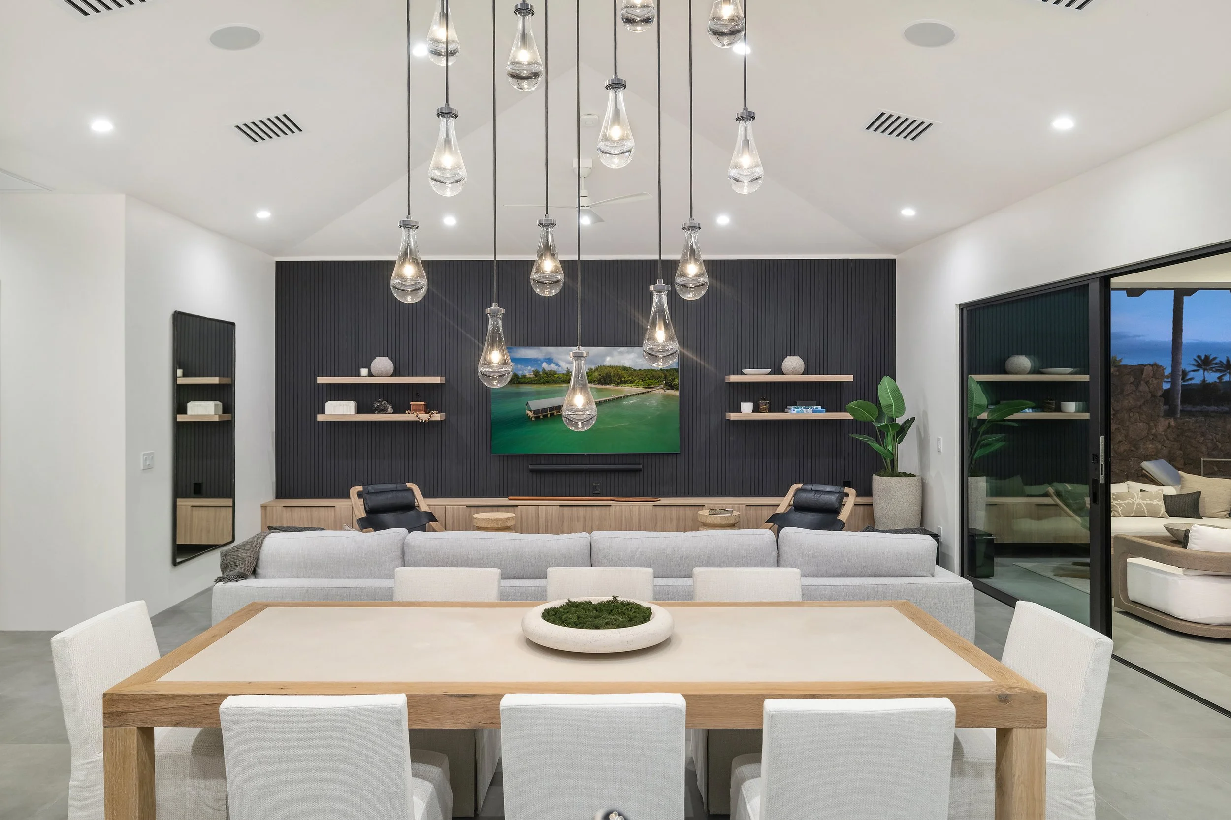 This modern coastal home is the epitome of refined island living. Its sleek black metal roof contrasts beautifully with the clean white exterior, creating a contemporary yet timeless design. Floor-to-ceiling glass sliding doors seamlessly connect the interior and exterior, inviting natural light and ocean breezes into the open-plan living spaces.