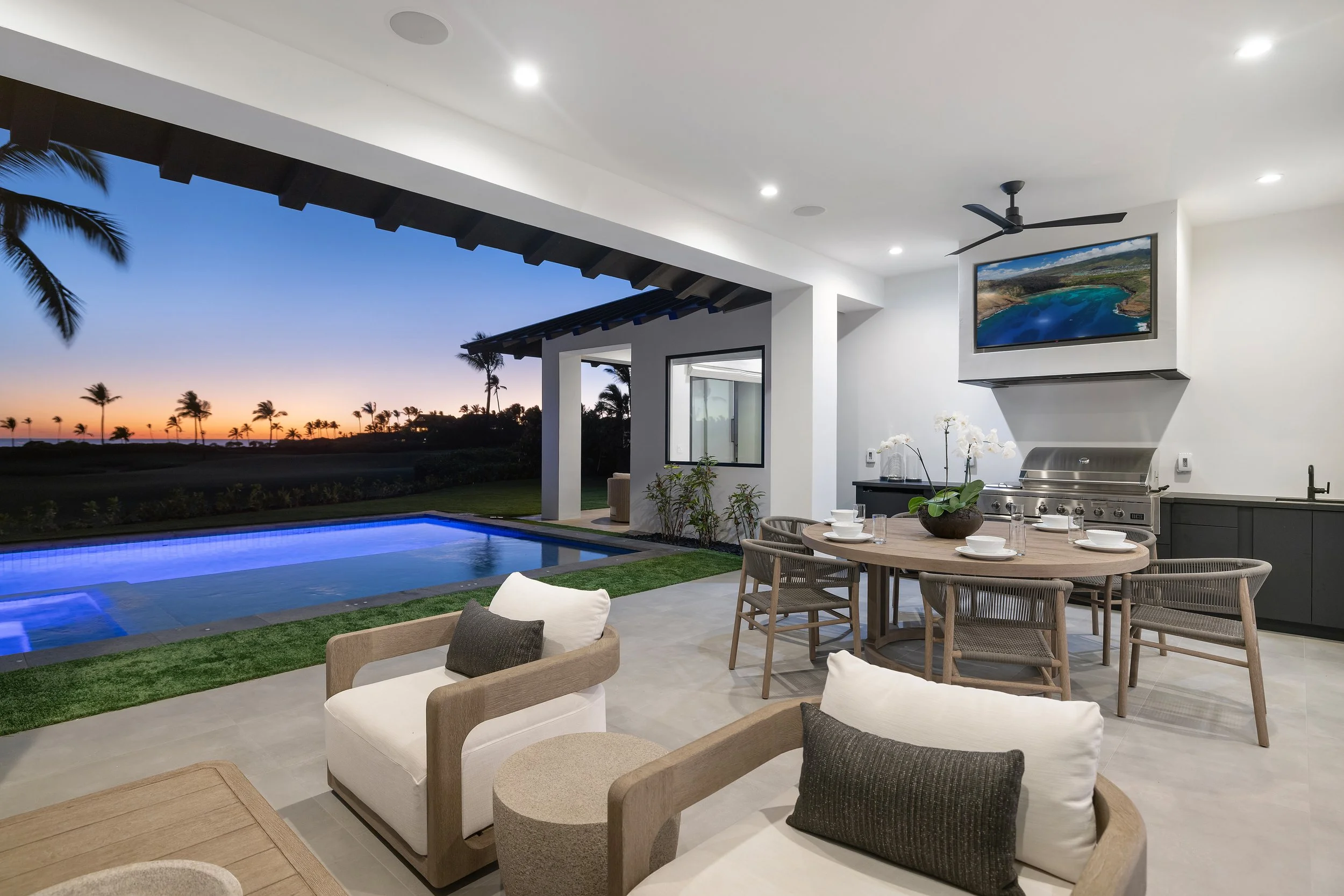 The lush, manicured lawn surrounds a sparkling blue pool that reflects the warm hues of the setting sun. A cozy lounge area with wicker and wood accents sits just outside the master bedroom, offering a serene retreat. The expansive outdoor dining and relaxation spaces are perfect for entertaining or unwinding with family and friends.